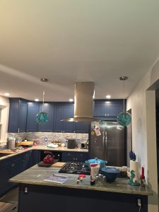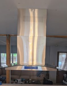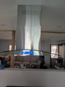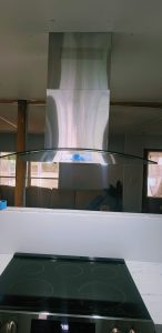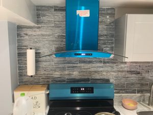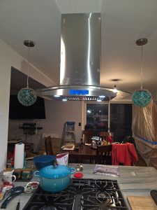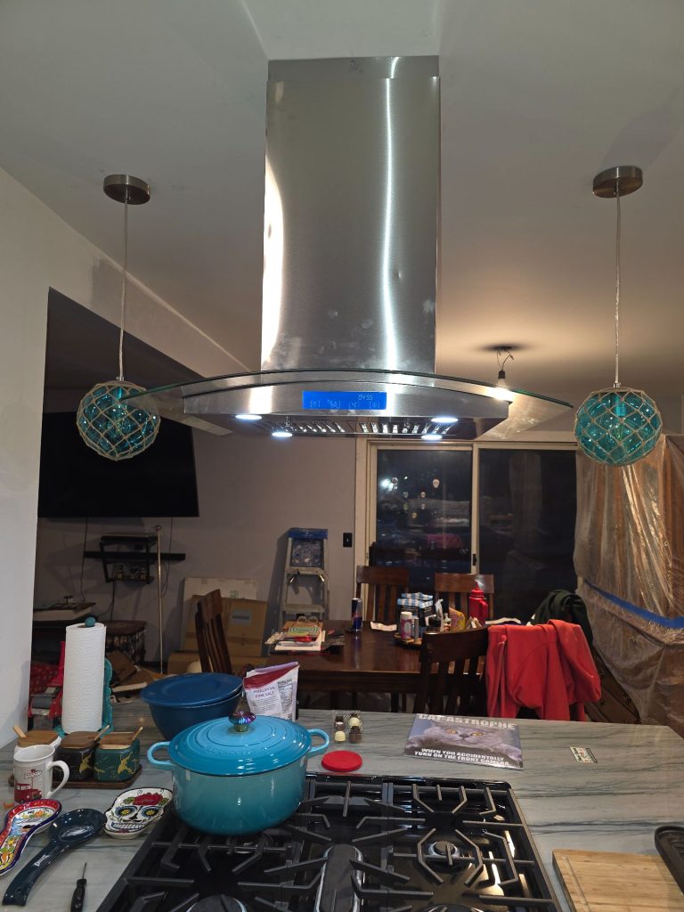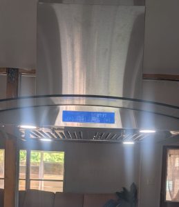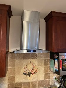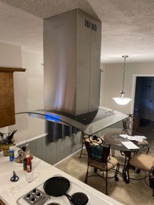 Removed old cabinets and old hood that I was constantly bumping my head on. Installation of Cosmo island rage hood was very easy with existing power source and external vent accessible. We love the new modern styling and the kitchen’s roomy feel w/o old cabinet over peninsula.
