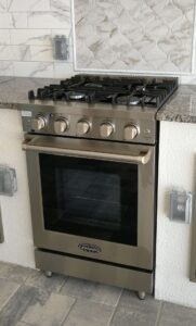 This little mini 24” range is delicate yet strong. We haven’t completely renovated, but by just replacing some of the appliances, in particular the range, it transformed our kitchenette. Once we put in the white faux marble countertops, white cabinet doors, and some matching stainless steel cabinetry hardware – it will be to die for!