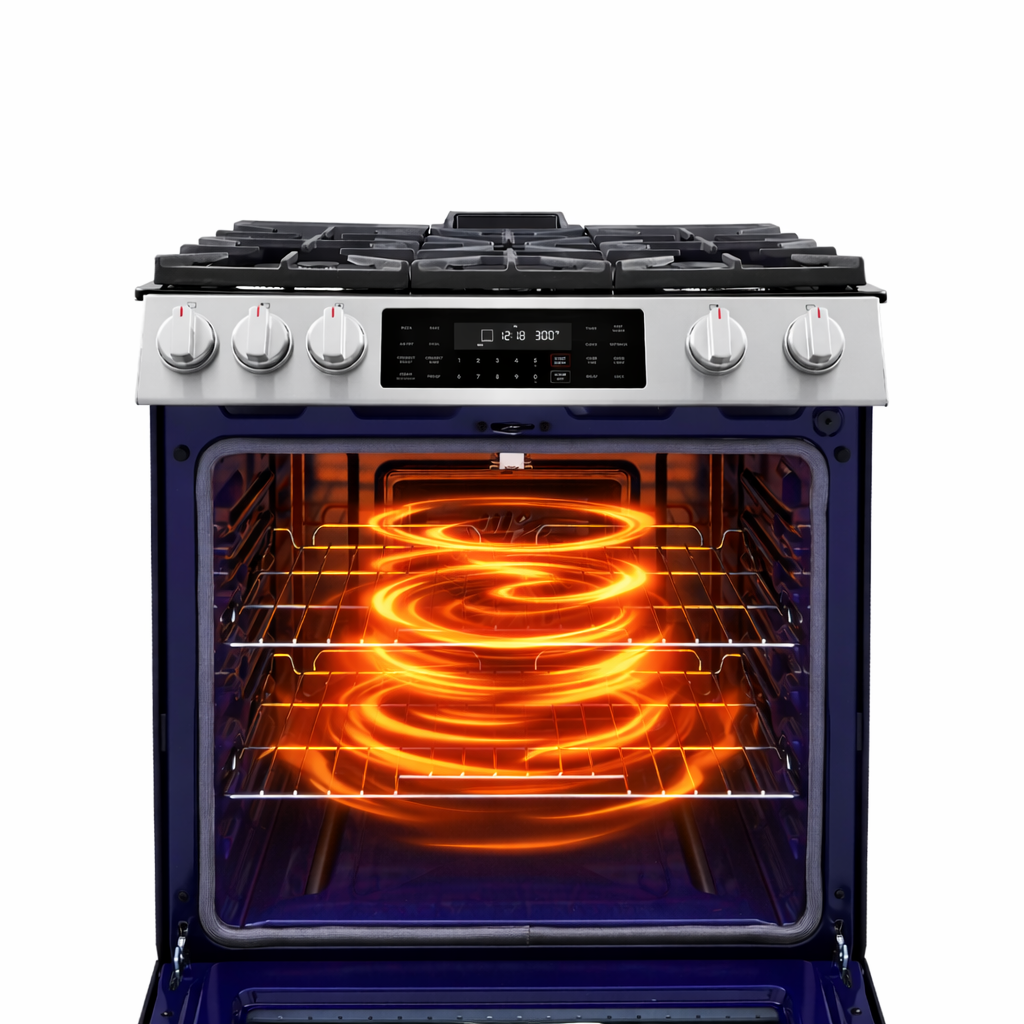 - 6.1 cu. ft. convection oven features a fan designed to distribute heat evenly around food and eliminate cold spots in the oven cavity, food cooks more evenly and in less time