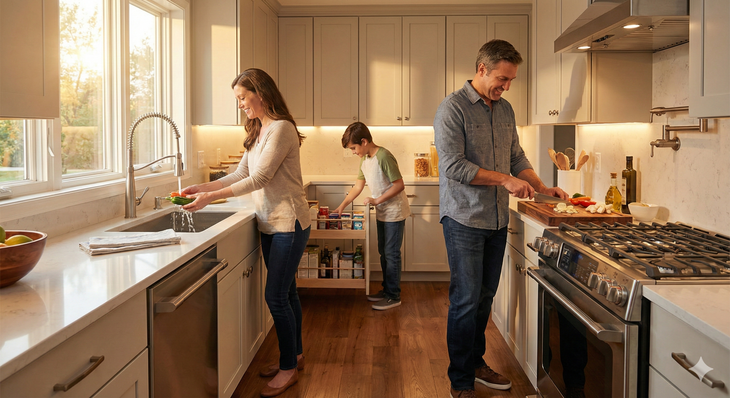 The daily payoff comes through faster meal preparation, reduced fatigue from unnecessary walking, smoother workflow during multi-dish cooking, and the ability for multiple people to use the kitchen simultaneously.